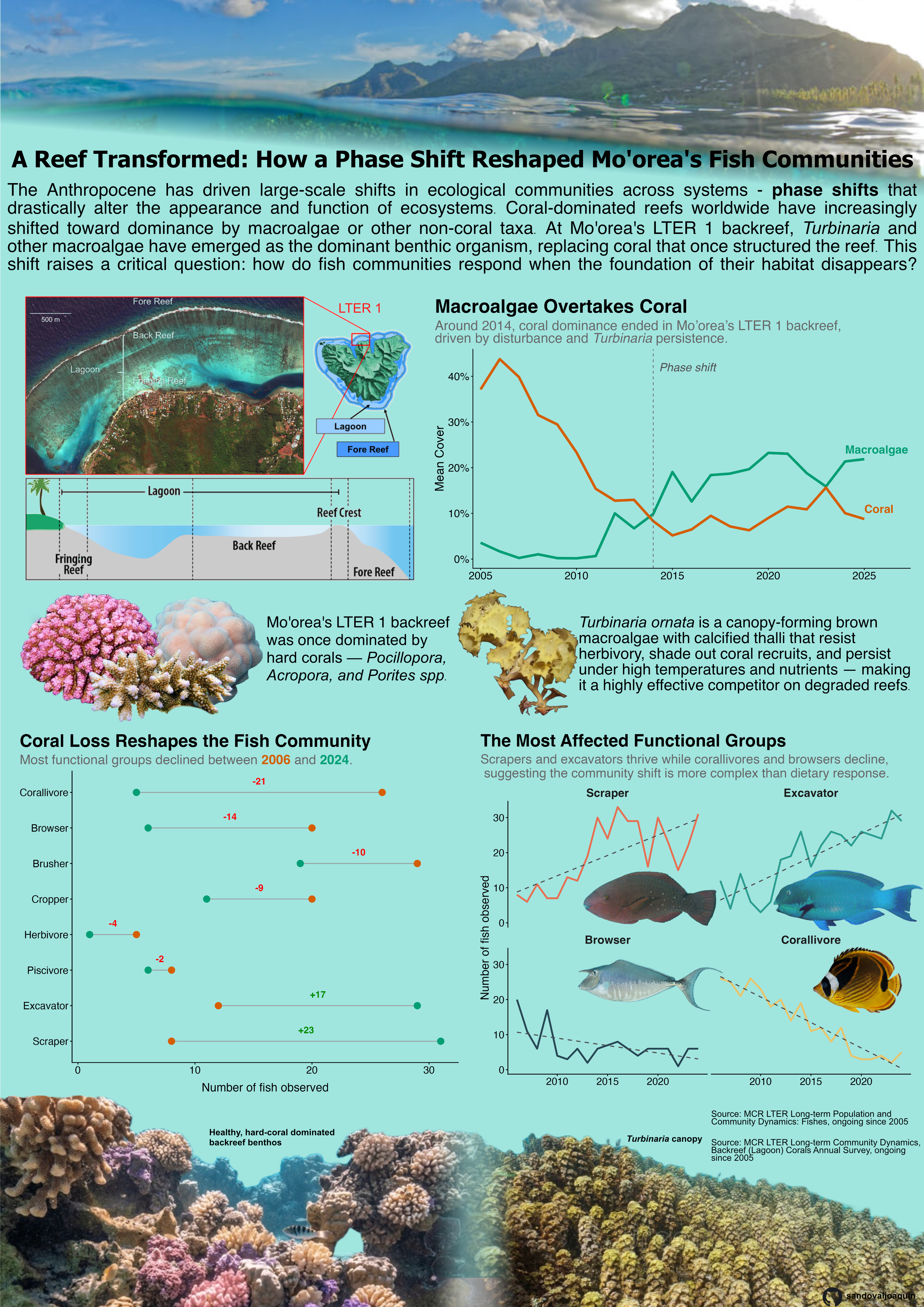 Coral reefs are among the most biodiverse ecosystems on Earth, yet they are disappearing at an unprecedented rate. The Anthropocene has driven large-scale phase shifts on reefs worldwide — transitions from coral-dominated to macroalgae-dominated states that fundamentally alter ecosystem structure and function. At Mo’orea’s LTER 1 backreef in French Polynesia, Turbinaria ornata, a canopy-forming brown macroalgae well-defended against herbivory, has emerged as a dominant benthic organism following decades of disturbance. As coral cover declines, how do fish communities respond when the foundation of their habitat disappears? Using long-term monitoring data from the MCR LTER (Moorea Coral Reef Long Term Ecological Research site, ongoing since 2005), this infographic tracks benthic cover and fish functional group abundance from 2006 to 2024. Together, these data reveal which functional groups thrive and which suffer as Mo’orea’s backreef undergoes a fundamental transformation.